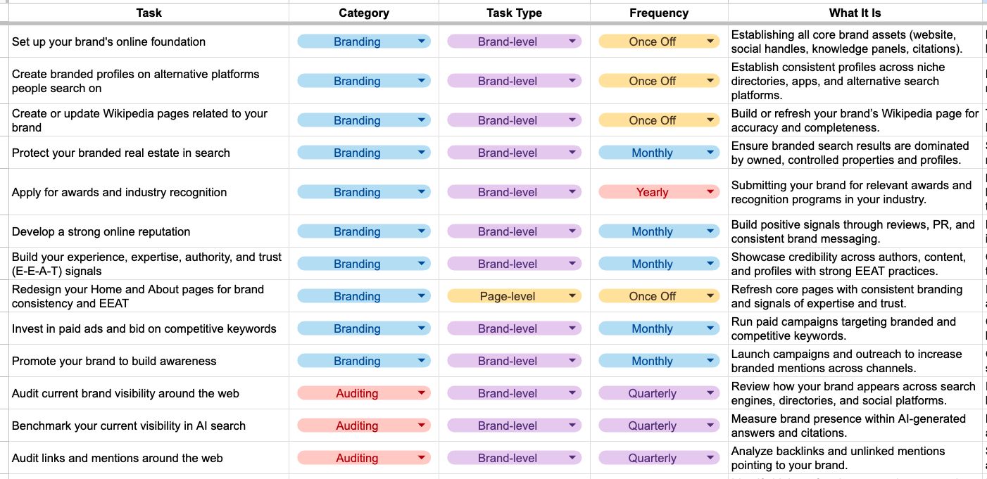 - 1 Set up your brand’s online foundation: Create a logo, brand colors, and messaging doc, and ensure that they are used consistently everywhere you have an online presence. Ensure your brand story and product categories are clearly connected. Create branded profiles on alternative platforms: Ensure your profiles are consistent across social media, directories, apps, and niche platforms. Doing so expands your brand recognition beyond Google and Bing, including on Reddit, TikTok, YouTube, and other platforms where people search. Create or update Wikipedia pages related to your brand: For big brands, ensure your Wikipedia entry is complete and accurate, providing one of the most trusted references for both search engines and AI models. Protect your branded real estate in search: Ensure that your branded search results are filled with pages you own, such as your website, social profiles, and listings. This stops competitors or negative results from taking valuable positions. Apply for awards and industry recognition: Submit to relevant industry awards and recognition programs to enhance your perceived authority, credibility, and visibility in traditional and AI search results. Feature these prominently on your website to build trust and increase conversions. Encourage happy customers to leave reviews: Build trust and develop a strong online reputation with positive reviews on Google, Trustpilot, and recommendations from users in online communities like Reddit. Build your experience, expertise, authority, and trust (EEAT) signals: Strengthen EEAT signals at a brand, website, and page level to win favor with search engines and AI platforms. Start by adding clear author bios, publishing expert credentials, and showcasing trusted reviews. Check your Home and About pages for brand consistency and EEAT: Consider redesigning your homepage (and other core pages) to ensure branding is consistent and you showcase clear trust signals, such as reviews, testimonials, awards, or certifications. Invest in paid ads and bid on competitive keywords: Google Ads and SEO can work together to increase brand awareness and demand, ensuring your name appears alongside (or above) competitors in key searches. Promote your brand to build awareness: Spark branded searches on Google by running social ads or email campaigns that highlight a unique offer and prompt people to search for your brand directly. Audit current brand visibility around the web: Review how your brand appears across search, directories, and platforms to uncover inconsistencies like: Different brand names (e.g., Domain vs The Domain Group) Old logos or inconsistent taglines Old addresses or phone numbers Benchmark your current visibility in AI search: Track how often your brand appears in AI-generated answers to establish a baseline for future growth. Audit links and mentions around the web: Use tools like Ahrefs’ Site Explorer to find lost, unbranded, or broken links and reach out to the website owners to reclaim them. You can also use Brand Radar to audit your brand mentions. Benchmark the number of mentions and compare with competitors to spot gaps you can fill. Audit your top pages visible in AI responses: Improve those that are underperforming, update those doing well, and improve their accuracy and business value. Audit your content completeness and topic coverage: Use AI Content Helper to evaluate whether your content fully covers subtopics and intents, ensuring comprehensive topical authority. Identify decaying content and update it: Refresh outdated pages with new information and links to recover rankings and preserve visibility in search and AI. To find decaying pages, look for:data-nobefore Dropped rankings for relevant keywords Fewer mentions in AI responses for key terms Decreased organic and AI traffic in analytics Outdated data or information in the body content Audit competitors to find gaps or new opportunities: Analyze competitor keywords, content, and formats to uncover areas where you can differentiate and outperform. Reverse engineer competitor visibility to find gaps to fill or new untapped opportunities. Do a brand gap analysis Do a content gap analysis Do a link gap analysis See what AI says about your brand and if it’s true: Check the accuracy of AI answers about your brand to catch errors or misinformation early. Do an AI brand gap analysis to close gaps against competitors: Compare your AI visibility with competitors and prioritize strategies to strengthen your presence.